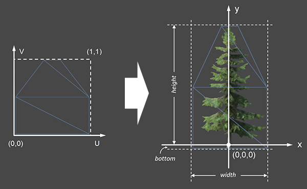UV-space vertices are expanded to 3D-space vertices, with a SpeedTree billboard at (0, 0, 0) in 3D space.