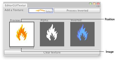void OnGUI() { texture = (Texture2D)EditorGUI.ObjectField(new Rect(3, 3, 200, 20), "Add a Texture:", texture, typeof(Texture2D)); if (GUI.Button(new Rect(208, 3, position.width - 210, 20), "Process Inverted")) { if (invertedTexture) DestroyImmediate(invertedTexture); //Copy the new texture invertedTexture = new Texture2D(texture.width, texture.height, texture.format, (texture.mipmapCount != 0)); for (int m = 0; m < texture.mipmapCount; m++) invertedTexture.SetPixels(texture.GetPixels(m), m); InvertColors(); showInverted = true; } if (texture) { EditorGUI.PrefixLabel(new Rect(25, 45, 100, 15), 0, new GUIContent("Preview:")); EditorGUI.DrawPreviewTexture(new Rect(25, 60, 100, 100), texture); EditorGUI.PrefixLabel(new Rect(150, 45, 100, 15), 0, new GUIContent("Alpha:")); EditorGUI.DrawTextureAlpha(new Rect(150, 60, 100, 100), texture); EditorGUI.PrefixLabel(new Rect(275, 45, 100, 15), 0, new GUIContent("Inverted:")); if (showInverted) EditorGUI.DrawPreviewTexture(new Rect(275, 60, 100, 100), invertedTexture); if (GUI.Button(new Rect(3, position.height - 25, position.width - 6, 20), "Clear texture")) { texture = EditorGUIUtility.whiteTexture; showInverted = false; } } else { EditorGUI.PrefixLabel( new Rect(3, position.height - 25, position.width - 6, 20), 0, new GUIContent("No texture found")); } }