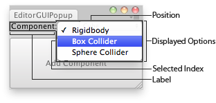 class EditorGUIPopup : EditorWindow { string[] options = { "Rigidbody", "Box Collider", "Sphere Collider" }; int index = 0;