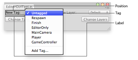 void OnGUI() { selectedTag = EditorGUI.TagField( new Rect(3, 3, position.width / 2 - 6, 20), "New Tag:", selectedTag); selectedLayer = EditorGUI.LayerField( new Rect(position.width / 2 + 3, 3, position.width / 2 - 6, 20), "New Layer:", selectedLayer);