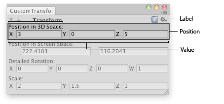 showing = EditorGUI.InspectorTitlebar(new Rect(0, 0, position.width, 20), showing, currObj, showing); if (showing) { if (currObj) { currObj.position = EditorGUI.Vector3Field(new Rect(3, 15, position.width - 6, 20), "Position in 3D Space:", currObj.position);