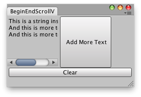 void OnGUI() { EditorGUILayout.BeginHorizontal(); scrollPos = EditorGUILayout.BeginScrollView(scrollPos, GUILayout.Width(100), GUILayout.Height(100)); GUILayout.Label(t); EditorGUILayout.EndScrollView(); if (GUILayout.Button("Add More Text", GUILayout.Width(100), GUILayout.Height(100))) t += " \nAnd this is more text!"; EditorGUILayout.EndHorizontal(); if (GUILayout.Button("Clear")) t = ""; } }