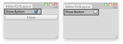 void OnGUI() { showBtn = EditorGUILayout.Toggle("Show Button", showBtn); if (showBtn) if (GUILayout.Button("Close")) this.Close(); } }