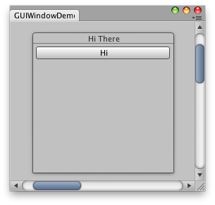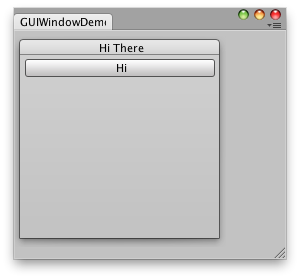using UnityEditor; using UnityEngine; using System.Collections; public class IMGUIWindowDemo : EditorWindow { // The position of the window public Rect windowRect = new Rect(100, 100, 200, 200); void OnGUI() { BeginWindows(); // All GUI.Window or GUILayout.Window must come inside here windowRect = GUILayout.Window(1, windowRect, DoWindow, "Hi There"); EndWindows(); } // The window function. This works just like ingame GUI.Window void DoWindow(int unusedWindowID) { GUILayout.Button("Hi"); GUI.DragWindow(); } // Add menu item to show this demo. [MenuItem("Test/GUIWindow Demo")] static void Init() { EditorWindow.GetWindow(typeof(IMGUIWindowDemo)); } }