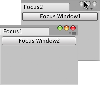 // Second window. using UnityEngine; using UnityEditor; using UnityEngine.UIElements; public class FocusExample2 : EditorWindow { public static FocusExample2 Instance = null; [MenuItem("Examples/Focus Example 2")] static void Init() { Instance = GetWindow<FocusExample2>("Focus2"); } void CreateGUI() { var button = new Button(() => { if (FocusExample1.Instance) FocusExample1.Instance.Focus(); }); button.text = "Focus Window1"; rootVisualElement.Add(button); } }