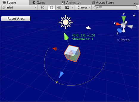 // Change the transform values for the selected object. // When selected this script starts and the handleExample is managed. // The HandlesGUI.BeginGUI() and EndGUI() functions allow the shieldArea // to be changed back to five, which is the starting value.