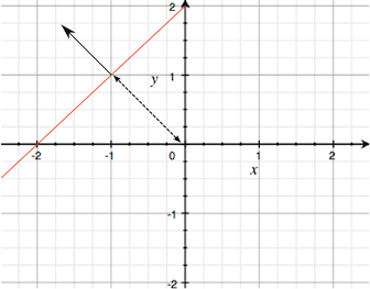 In the previous image a plane is represented as a diagonal red line which passes through -2, 0, offset rather than the origin point <0,0,0>. A second line representing a normal vector with a positive y component indicates which direction the plane faces. A third dotted line defines the distance between the plane and the origin point.
