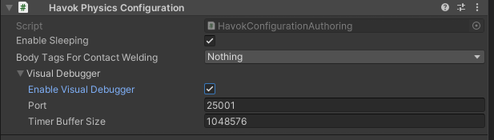 2. Add a Havok Configuration Authoring component anywhere in the scene hierarchy (usually on the same node as the PhysicsStep component), and toggle Enable Visual Debugger