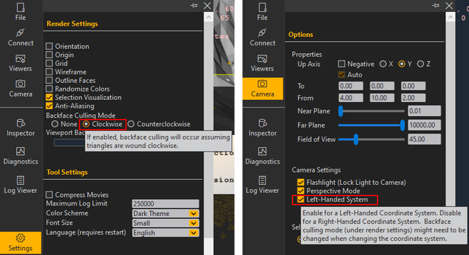 4. The VDB defaults to a right handed coordinate system, with a counter clockwise triangle winding. To change these to Unity's left handed system change the following settings in the "Settings" and "Camera" panels respectively.