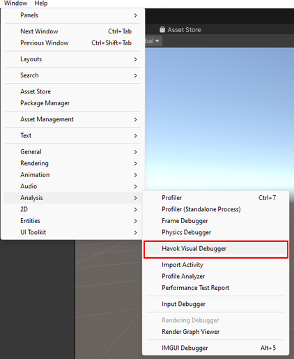 3. While a Havok Physics simulation is running click menu Window > Analysis > Havok Visual Debugger to launch the application.