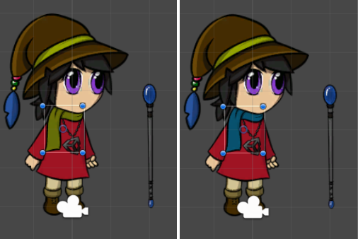 In the following example, we have two Sprites that are variations of the character’s scarf - one green and one blue. This workflow demonstrates how to switch from one to the other in the same Prefab.