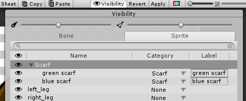 Place the Sprites for both scarves into the same Sprite Library Asset, and add them both to the same Category named ‘Scarf’. You can do this directly in the Skinning Editor via the Sprite tab in the Sprite Visibility panel.
