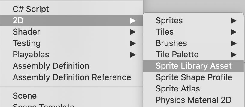 To create the Asset, go to Assets > Create > 2D > Sprite Library Asset.