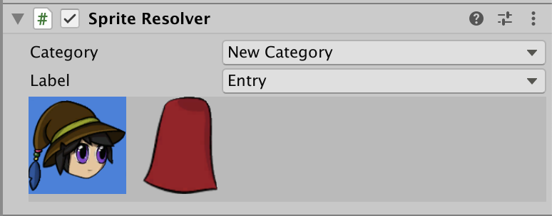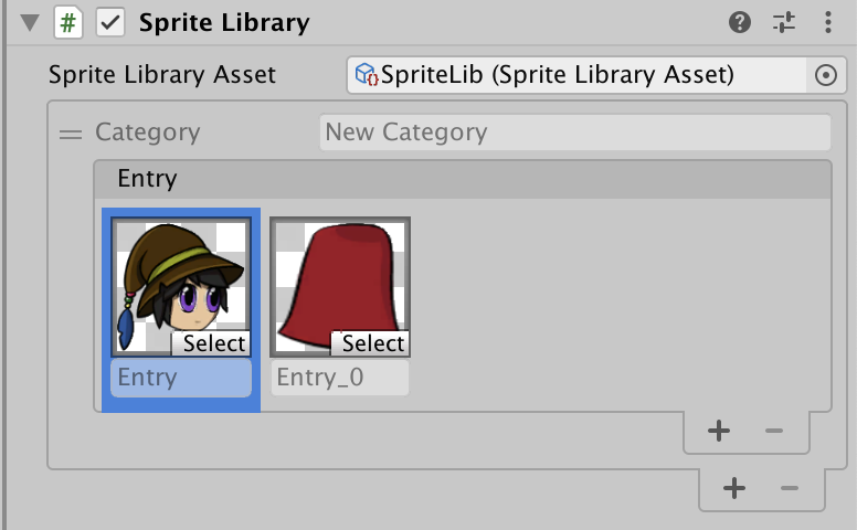 Similar to the Sprite Library Asset’s Inspector window, you can add new Categories, change the Sprite an Entry refers to, and add a new Sprite Entry into the Category in Sprite Library component's Inspector window.