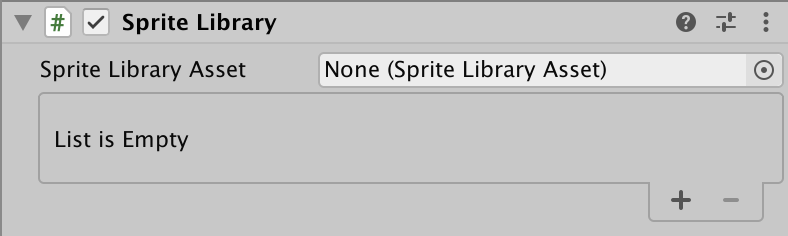 List Lists the Categories contained in the Sprite Library Asset. Select + to add a new Category or - to remove the currently selected Category from the Sprite Library Asset.