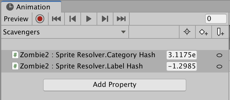 The Sprite Resolver has been changed in 2D Animation version 6.0 onwards so that when the component is keyframed in the Animation window, one consolidated property change is recorded instead of the two property changes in previous versions.