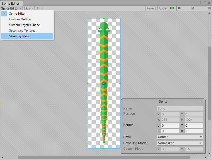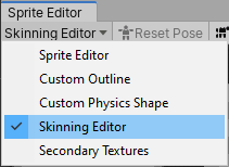 In the Sprite Editor, select the Skinning Editor module from the upper left drop-down menu of the editor window.