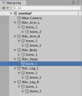 The GameObjects rearranged to mimic the original actor. - Create another GameObject at the root of all the GameObjects, and call it 'Rikr_Root'. Reparent the 'Rikr_Body' GameObject to the 'Rikr_Root' as its child.