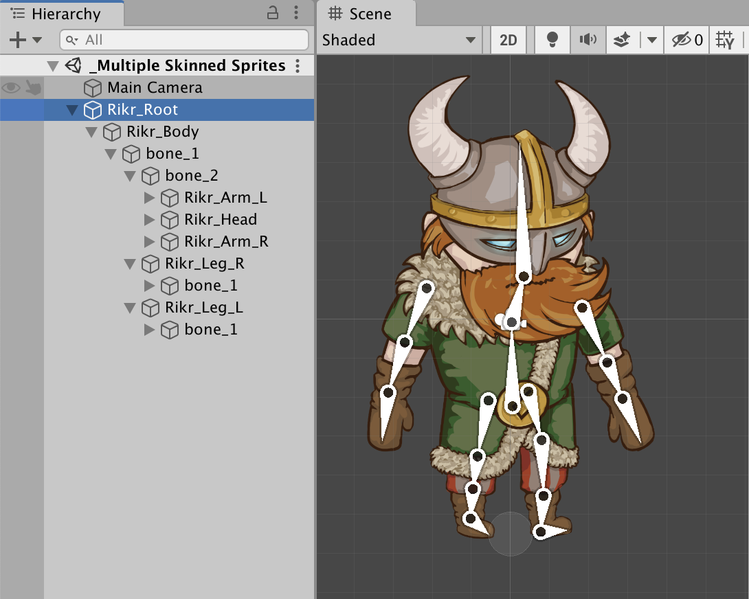 Open the Asset Assets/Samples/2D Animation/[X.Y.Z]/Samples/3 Multiple Skinned Sprites/Sprites/Rikr.png in the Skinning Editor module to examine how the Sprite is rigged.