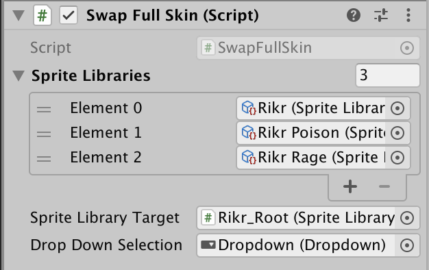 A custom MonoBehaviour script called SwapFullSkin is attached to theRikr_Root GameObject. This script is located in Assets/Samples/2D Animation/[X.Y.Z]/Samples/5 SpriteSwap/Scripts/Runtime/SwapFullSkin.cs