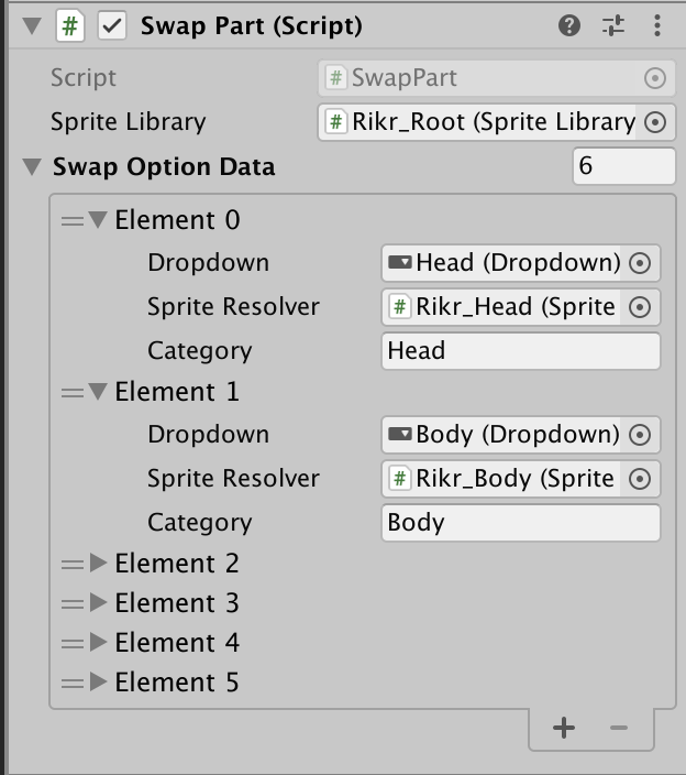 The script holds a reference to a Sprite Library component for retrieval of swappable Sprites. It also holds an array of data that describes the Category of Sprites in the Sprite Library that can be changed by a Sprite Resolver component.