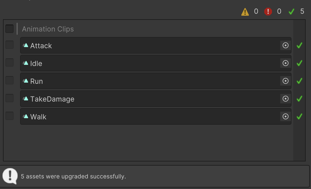 Once the upgrading process is complete, the 2D Animation Asset Upgrader will display the status the upgrading process for each of the selected Animation Clips.