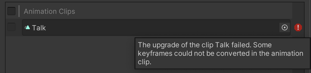 The upgrade of the clip Talk failed. Some keyframes could not be converted in the animation clip.
