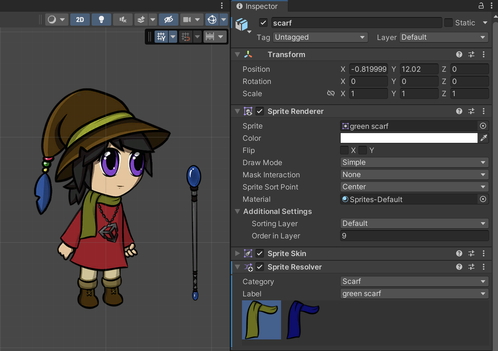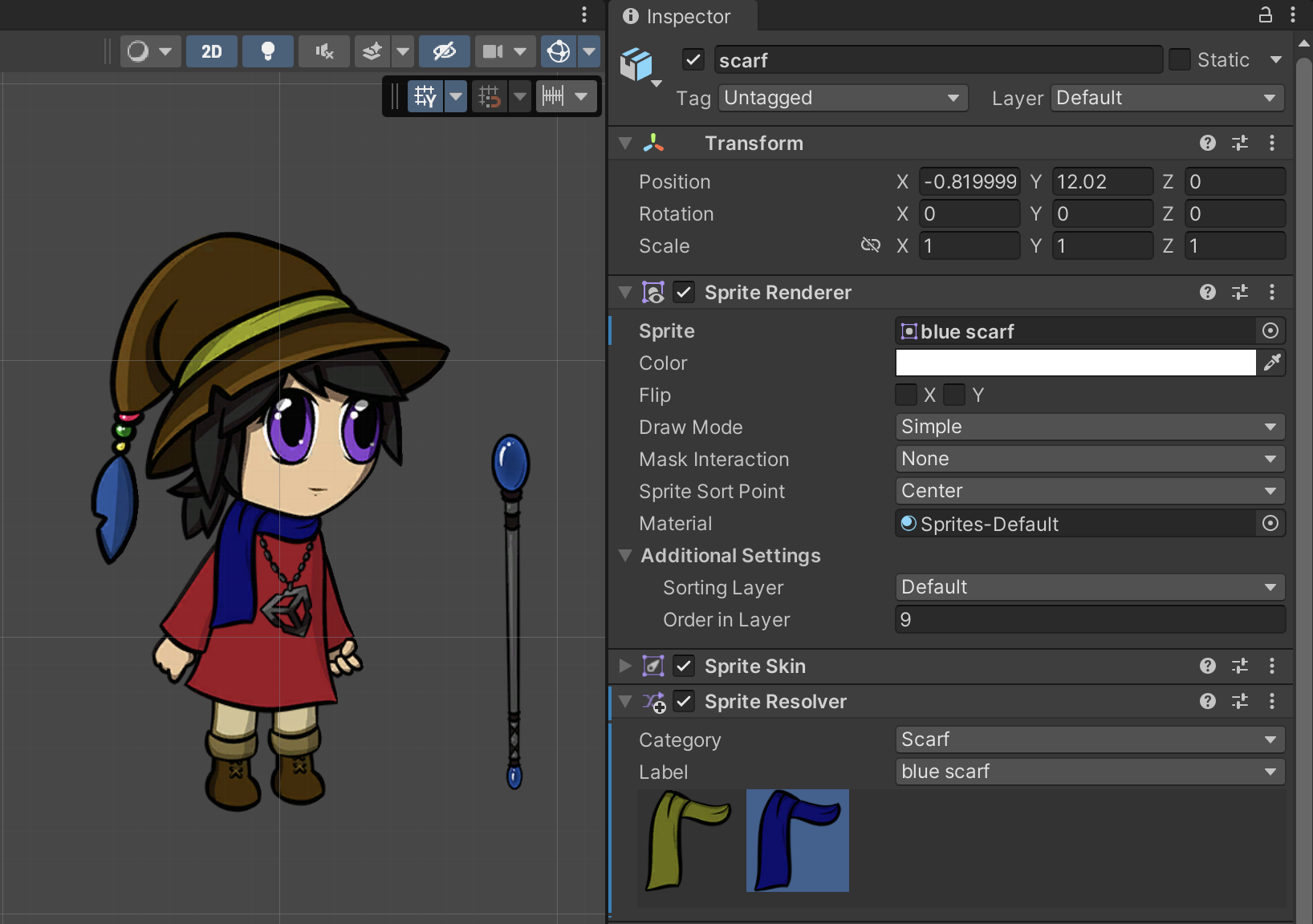GameObject. The Sprite Resolver‘s visual selector displays the two Sprites available in theScarf
