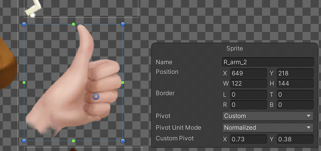 In this example, the two swapped Sprites are aligned by changing the Pivot property from Center to Custom Position, and inputting the Custom Pivot position that aligns the thumbs up