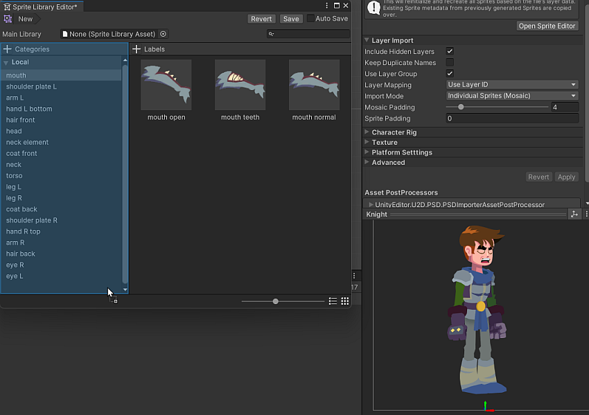 - PSD Importer package is required for the Sprite Library Editor to recognize imported .psb files.
