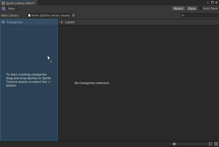 This page shows the different ways you can create or edit Categories and Labels in a Sprite Library Asset by dragging sprites directly into the Sprite Library Editor window.