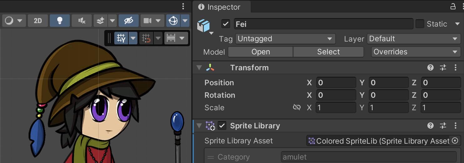 The grayscale Sprites with the same corresponding Category and Label names.Drag the color Model Prefab into the Scene view, and go to the root GameObject. Add a Sprite Library component to the root GameObject and assign the color Sprite Library Asset created in step 3 to the Sprite Library Asset property.