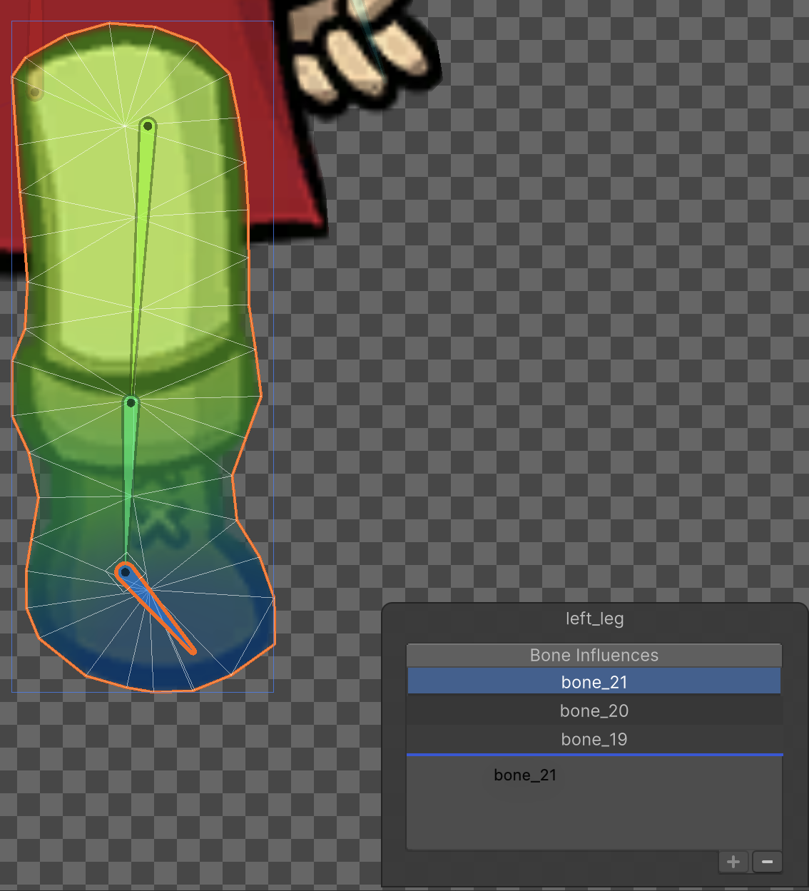 When the Skinning Editor is set to Character mode, the Bone Influences panel allows you to add a bone to the list which includes its influence in the deformation of the selected Sprite’s mesh, or remove a bone from the list which removes its influence instead.