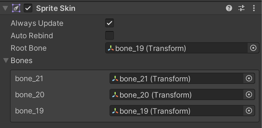 The order of the bones in the Bone Influences panel determines the order of the bones on the Sprite Skin component. This is especially important when replacing the Sprite for deformation in the Sprite Renderer, such as when using Sprite Swap, as you can ensure the bone order remains the same between the Sprites and that the correct Transform drives the correct deformation.