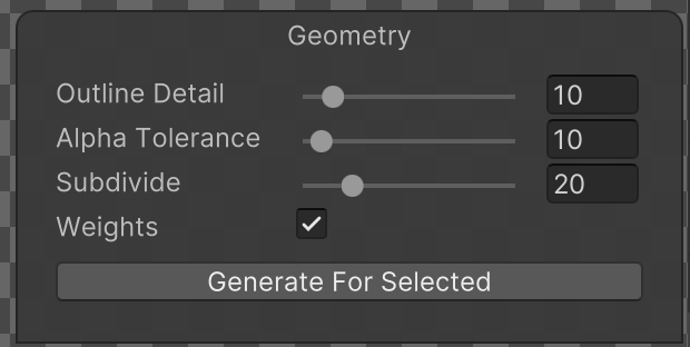 Outline Detail | Use the slider to adjust the accuracy of the generated geometry’s outline to the outline of the Sprite. Smaller values create simpler outlines, while larger values create denser outlines that fit to the Sprite’s outline more accurately. |