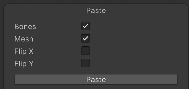 - Mesh, weights, and bone association of source Sprite(s) are pasted to destination Sprite(s) with the same names.