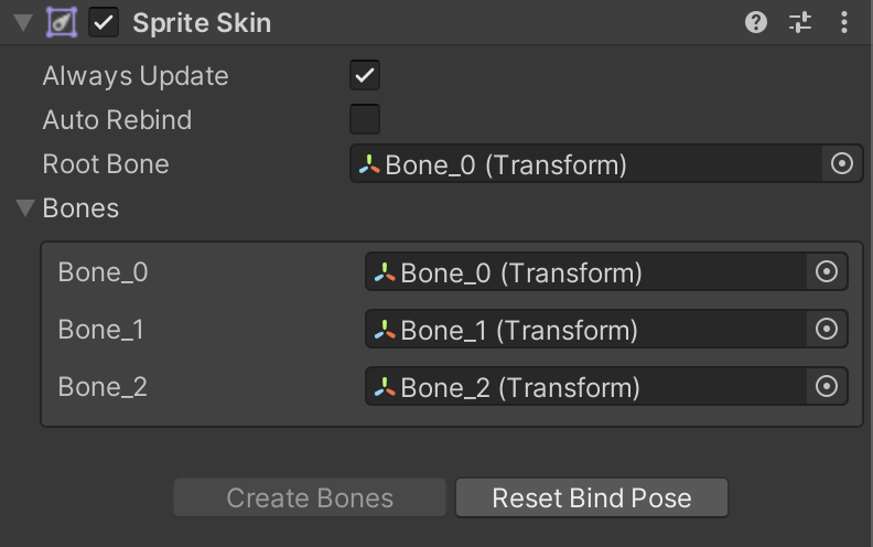 When you enable Auto Rebind, Sprite Skin attempts to automatically locate the GameObject Transform that is needed for the current Sprite assigned to the Sprite Renderer. This is triggered when the Sprite in the Sprite Renderer property is changed.
