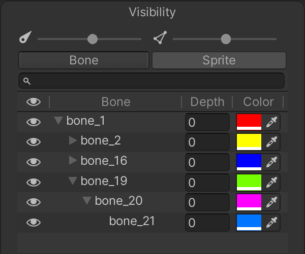 The panel appears on the right-side of the editor window. It has two sliders at the top that control the visibility of the bones and