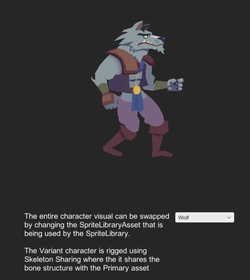 This sample's setup is similar to the one in the Full Skin Swap sample. The visual Assets are located in Assets/Samples/2D Animation/[X.Y.Z]/Samples/5 SpriteSwap/Sprites
