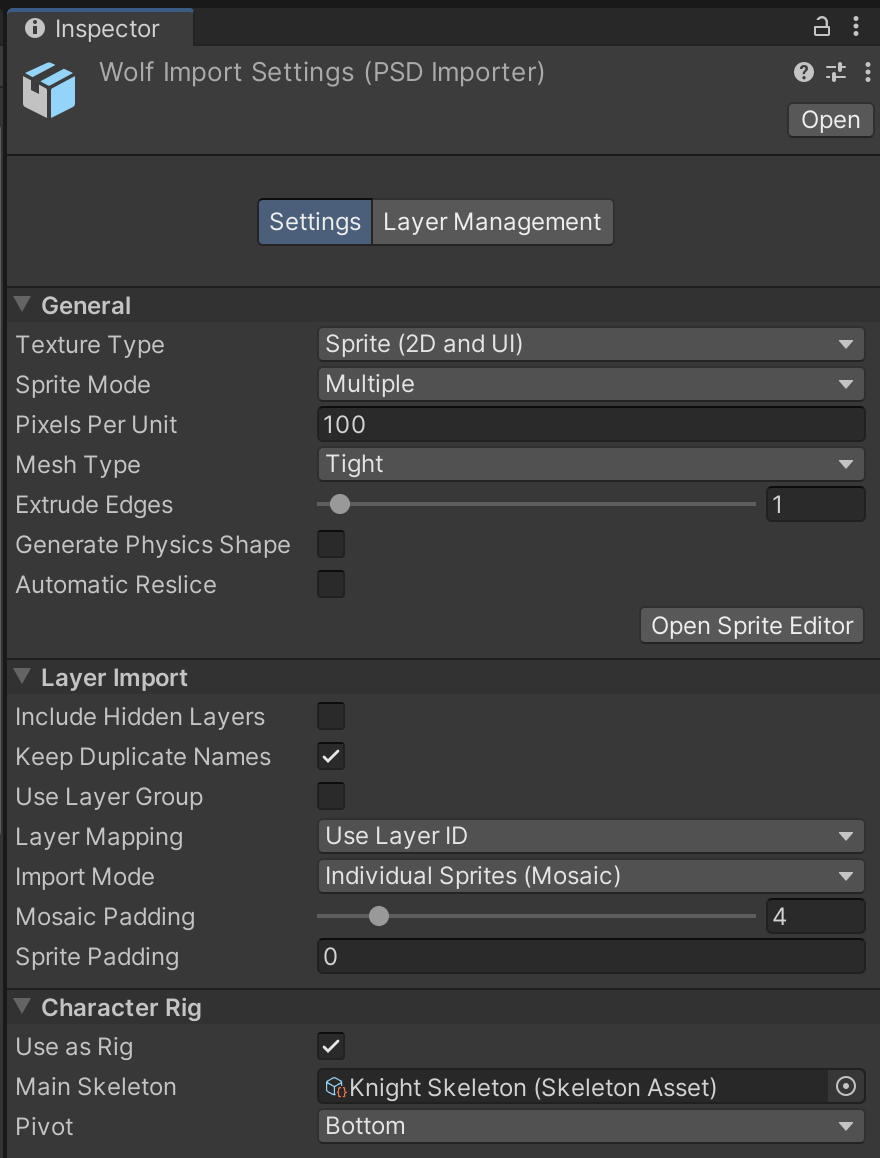 This sample demonstrates how Skeleton sharing can be set up and leverages on the other samples before this. Note that the following requires the PSD Importer installed. Open the 5 Skeleton Sharing.unity