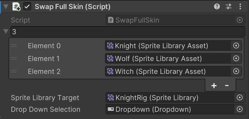 Where a value changes in the UI Drop Down List, the component sets the relevant Sprite Library Asset to be used for the Sprite Library component.