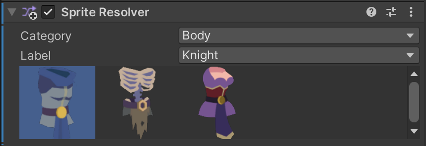 Add the Sprite Resolver component to each of the Sprite Renderers under the KnightRig