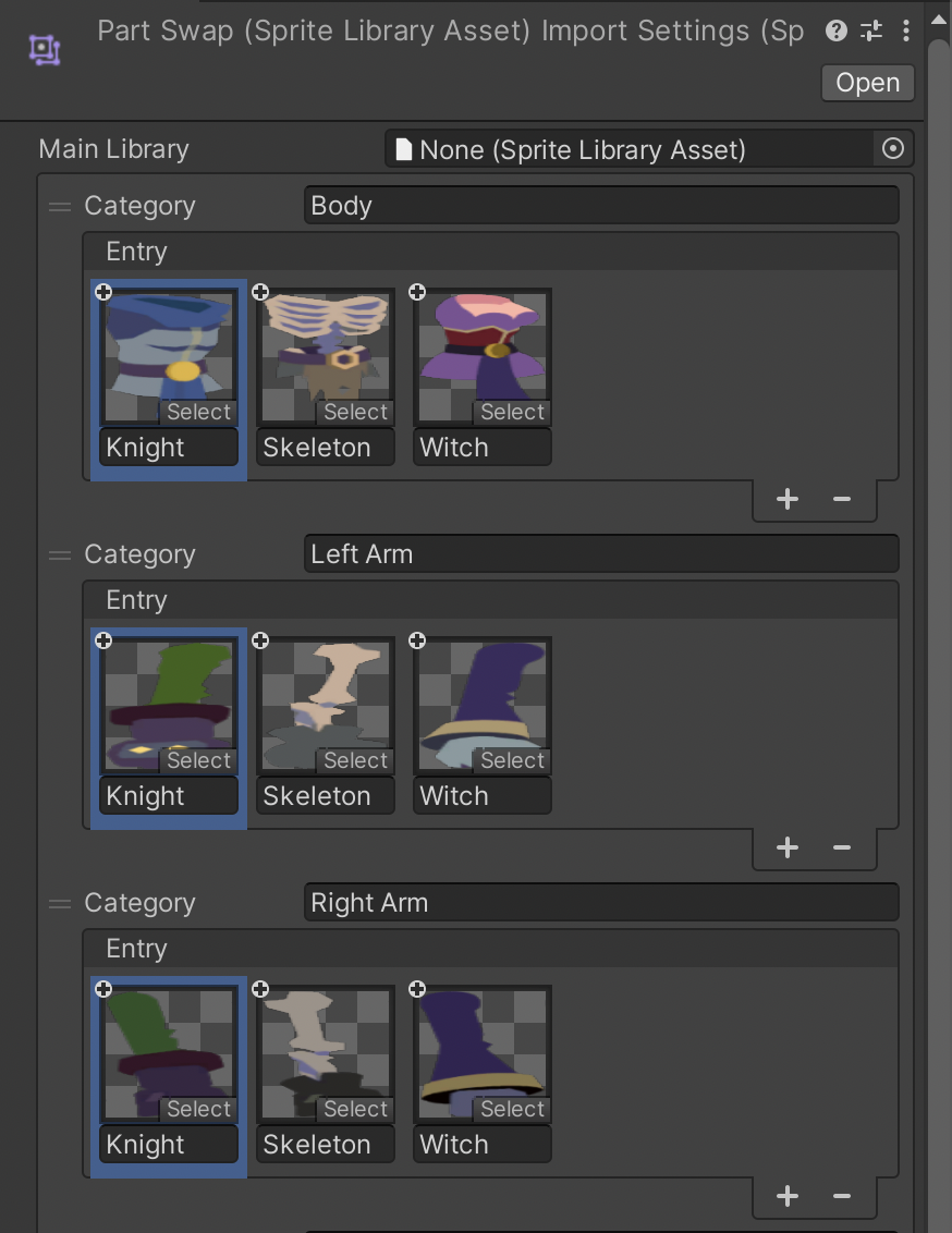 A Sprite Library Asset containing Sprites made from all three graphic Assets above is created. A Category is created for each body part of the actor, with three Entries derived from the three different versions of the character. The Asset is located in Assets/Samples/2D Animation/[X.Y.Z]/Samples/5 SpriteSwap/Sprite Library/Part Swap.spriteLib