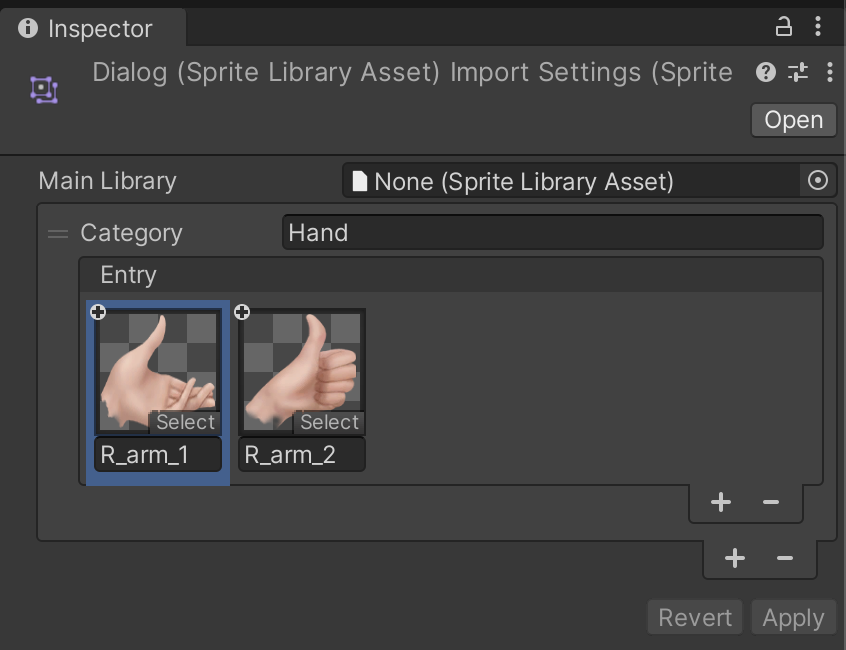 Asset to its Sprite Library Asset property.Add the Sprite Library component to