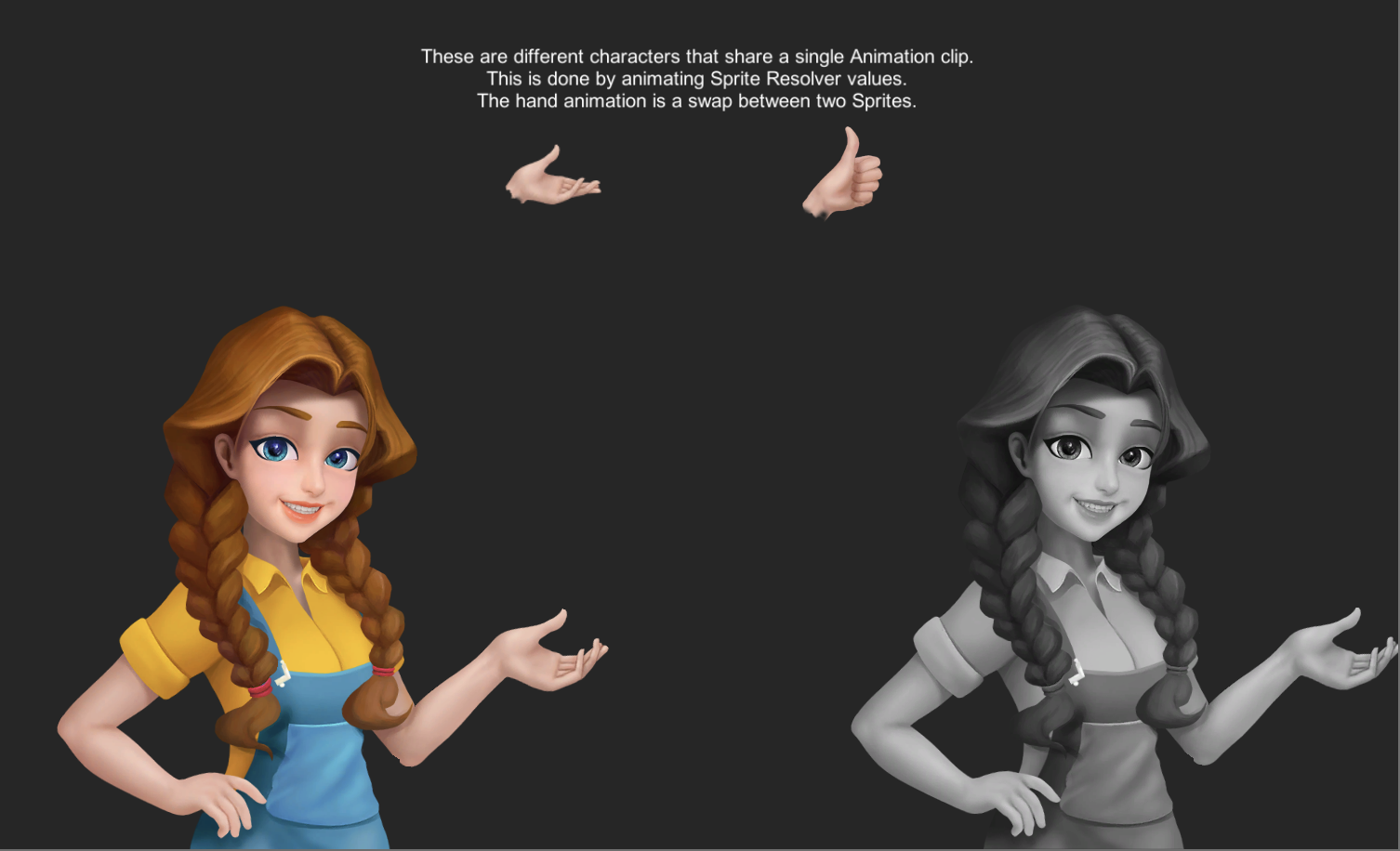 These Assets are imported with the PSD Importer with its Character Rig property enabled. Both Assets are rigged with the same skeleton, and each Asset has two different Sprites for the hands which are swapped during the animation.