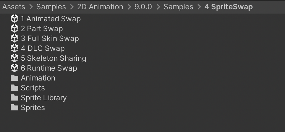 The Scenes for the following samples can be all found in Assets/Samples/2D Animation/[X.Y.Z]/Samples/4 SpriteSwap