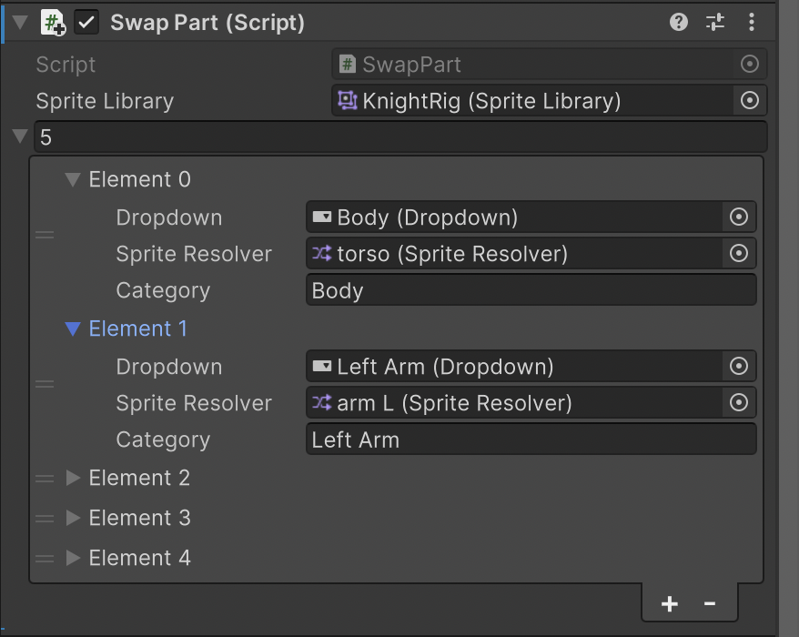 The script holds a reference to a Sprite Library component for retrieval of swappable Sprites. It also holds an array of data that describes the Category of Sprites in the Sprite Library that can be changed by a Sprite Resolver component.