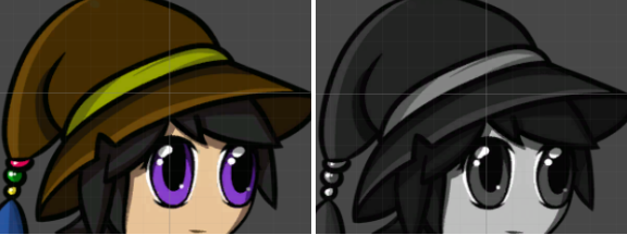 - First create visual variants of your actor's artwork. In this example, the original artwork is in color and a grayscale variant of it is created as an alternate Sprite set. Both should be saved to separate .psb files.