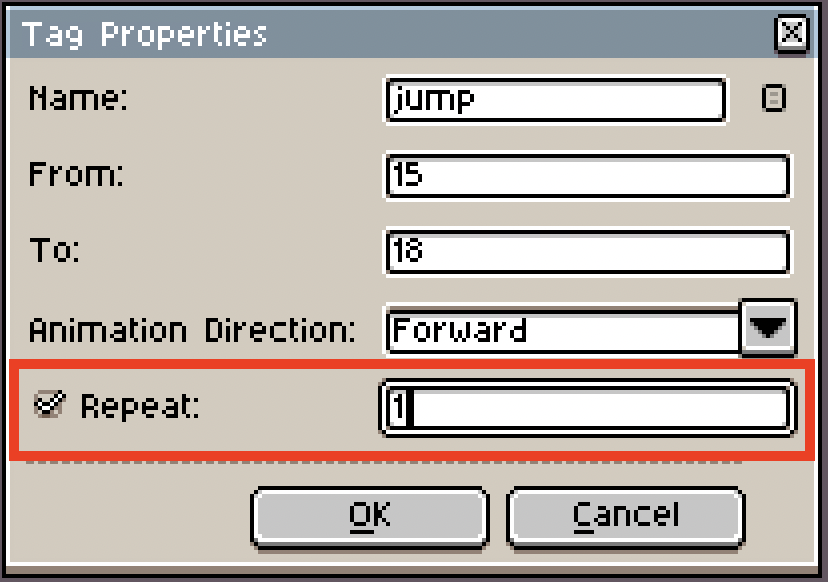 By default, Animation Clips generated from Aseprite Tags will automatically loop. To disable looping, open Aseprite and bring up the Tag Property window of the Tag you wish to turn non-looping. In the Repeat field, change the value from ∞ to 1 (Aseprite Importer only supports looping and non-looping. Any value greater than 1 will still result in only a single playback).