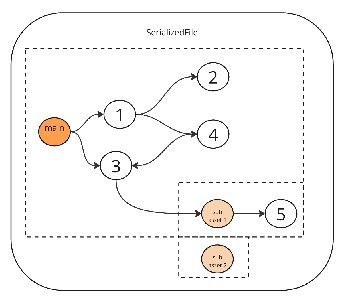 The following diagram illustrates objects (circles) inside a Unity asset, with direct references shown as arrows. In this example, the main object references (directly or indirectly) all objects except "sub asset 2":